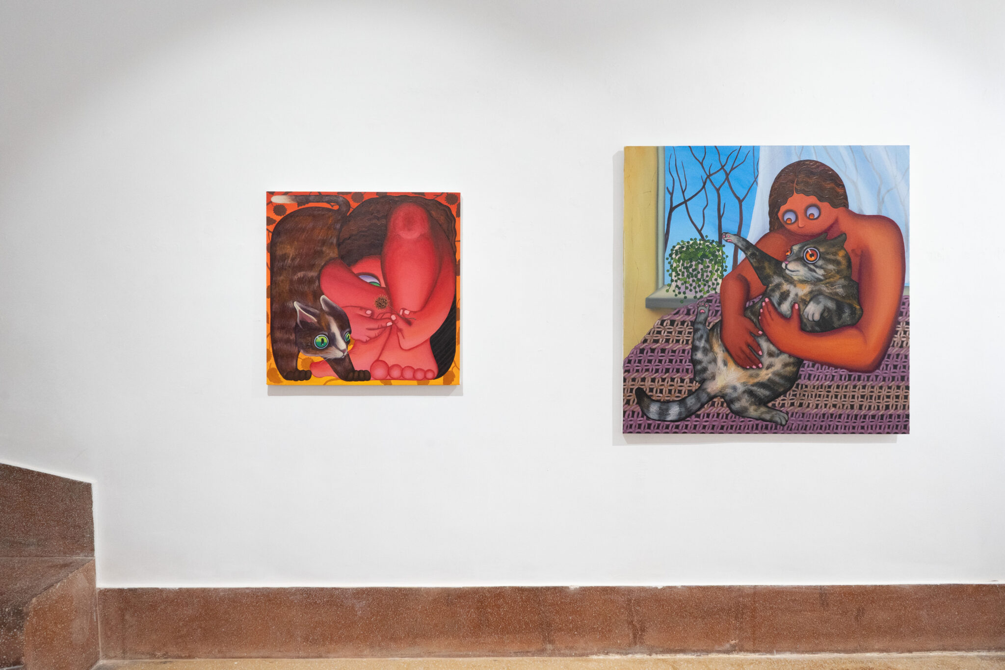 Influenced by the unique architecture and layout of the gallery which spans three floors of a former residential apartment complex, the exhibited paintings are smaller in size, however Wadlington maintains a practice of painting subjects and scenes at a 1:1 human scale. While Wadlington’s large-scale paintings present her audience with a scene that is “whole,” the featured pieces dial in on smaller moments and interactions within the overall plot, offering a more direct encounter between viewer and subject. Further, the time allotted to Wadlington by working at an intimate scale enabled her to place a greater focus on the details of each composition, such as building up texture or playing with hues. Continuing to explore the same themes of suburbia and anthropomorphism, Wadlington looked to this body of work partially as an opportunity to progress formal techniques.