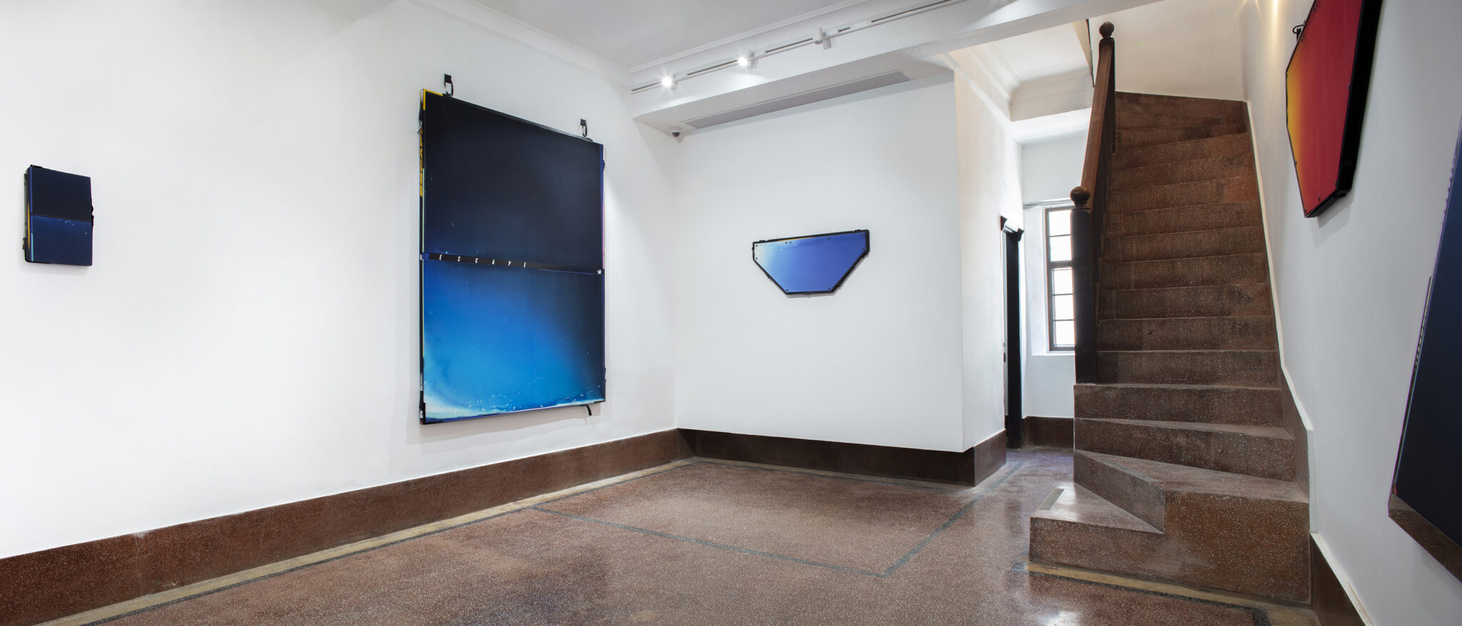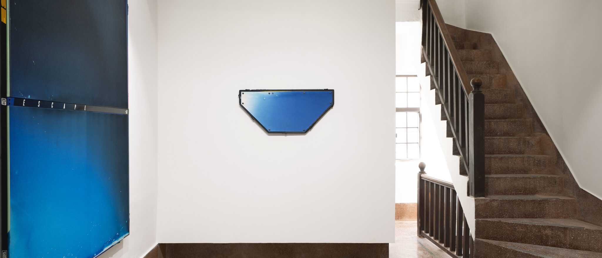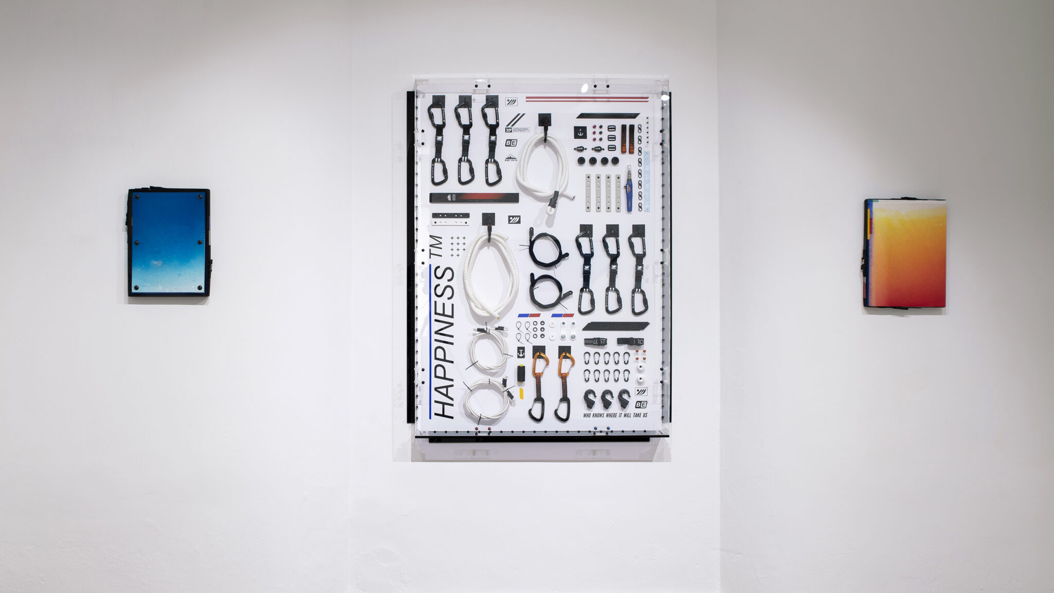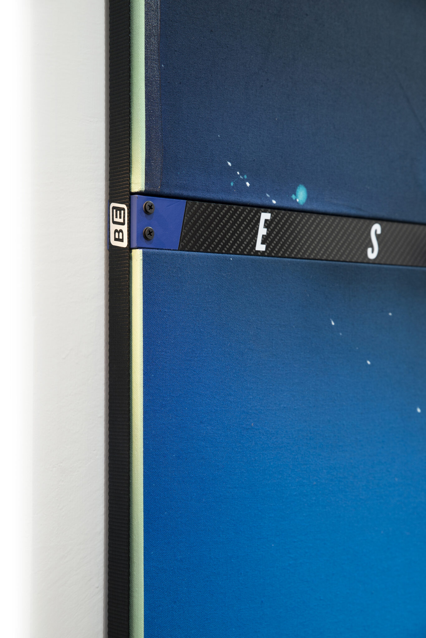 Grappling with contemporary manifestations of mythology and systems of belief, the work of Ben Edmunds is chiefly characterised by its combining the “holy” formal modes of Modernist Abstract Expressionism, colour field painting and Minimalism, with the highly stylised and contemporary accents of extreme sports and hi-tech fashion. Out of this synthesis of celebrated iconographies, Edmunds treads a precariously fine line between cliché and a sincere acknowledgement of human desire. Because desire here is undeniably a fundamental currency of the paintings; underwritten in the dyed canvases, the handmade carbon fibre components, the carabiners and short incidents of text, is an implicit understanding that we are unsatisfied – that as an artist and as a viewer, we approach the world around us impoverished and in need of moralising, rationalising sustenance. In an energetic environment of fashions and trends, of juice-clenses and cross-fit, Edmunds’ paintings appeal to the “desiring-body”, to the appetite of the consumer who needs experiences more than they need objects.