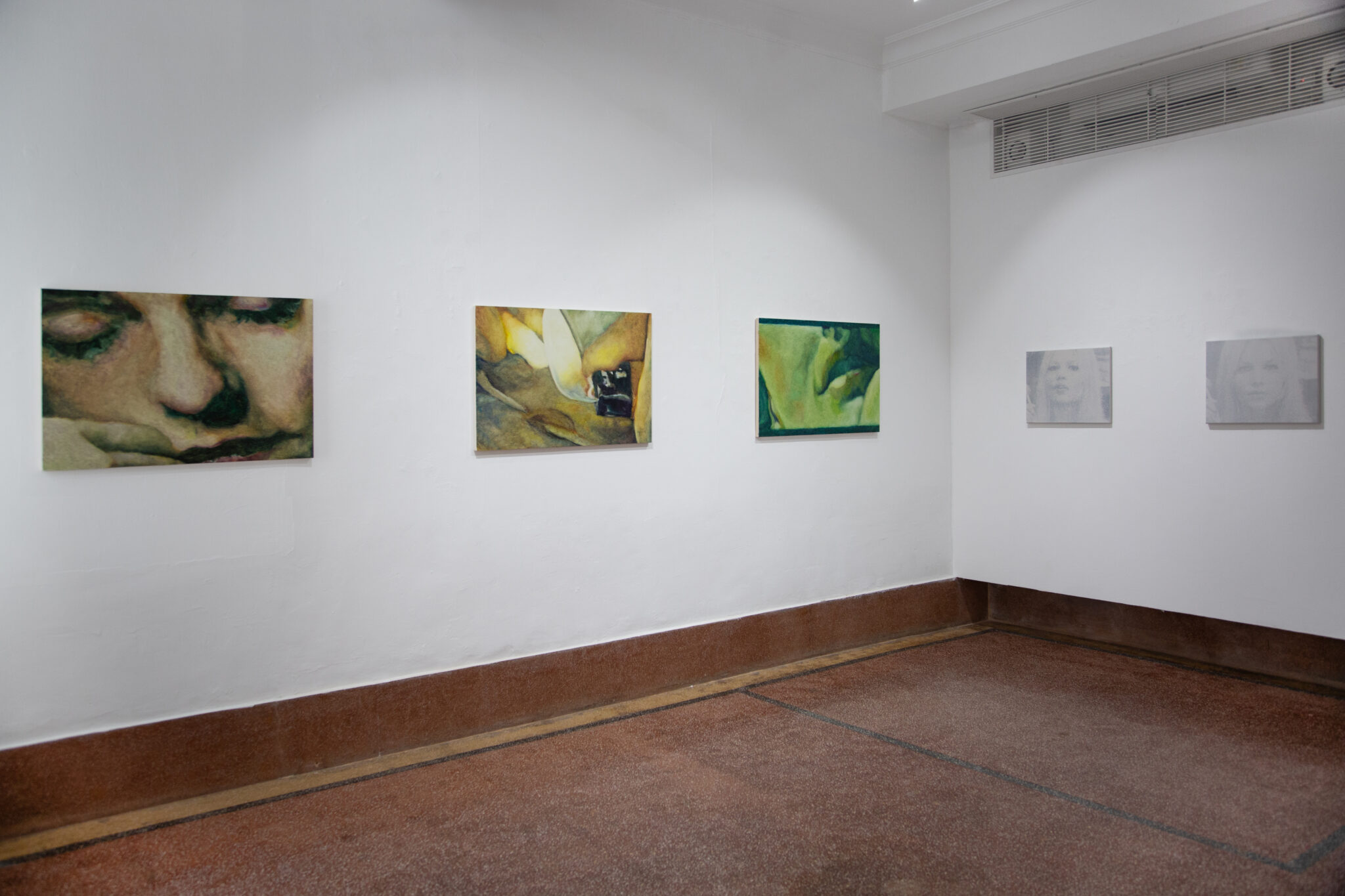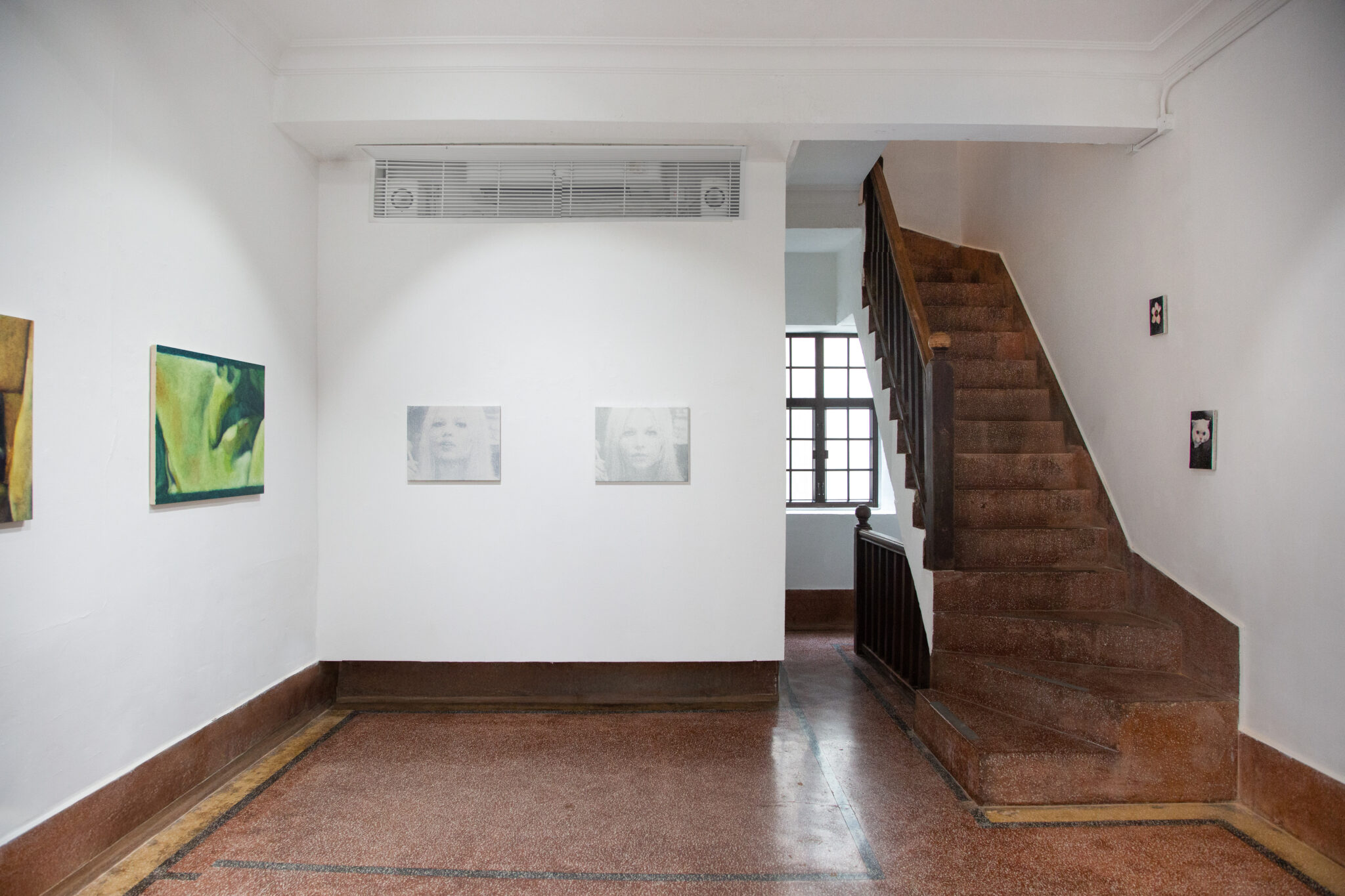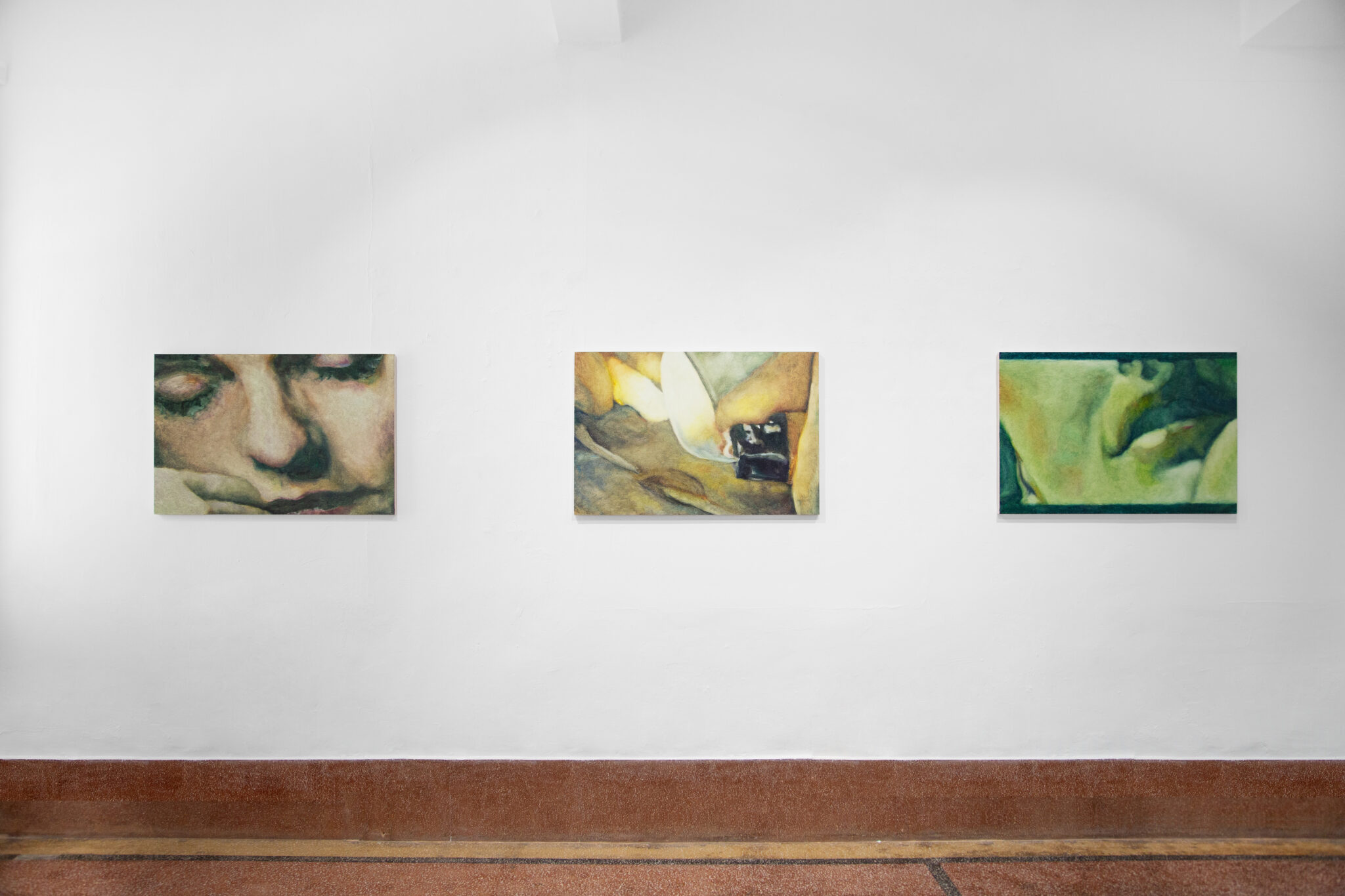 If the intention of Jones’ artworks is to involve the viewer, then the works of Bartosz Kowal pushes them away. Kowal’s paintings depicts close-up inspections of a figure’s face, though always averting their gaze. Merely missing their eyes by either displacing the frame or peering only as the figure’s eyes close, his images are engaged in a to-and-fro between looking and looking away. Successively building suspense with each glance, the artworks are as if a prelude – always almost, but never there.
