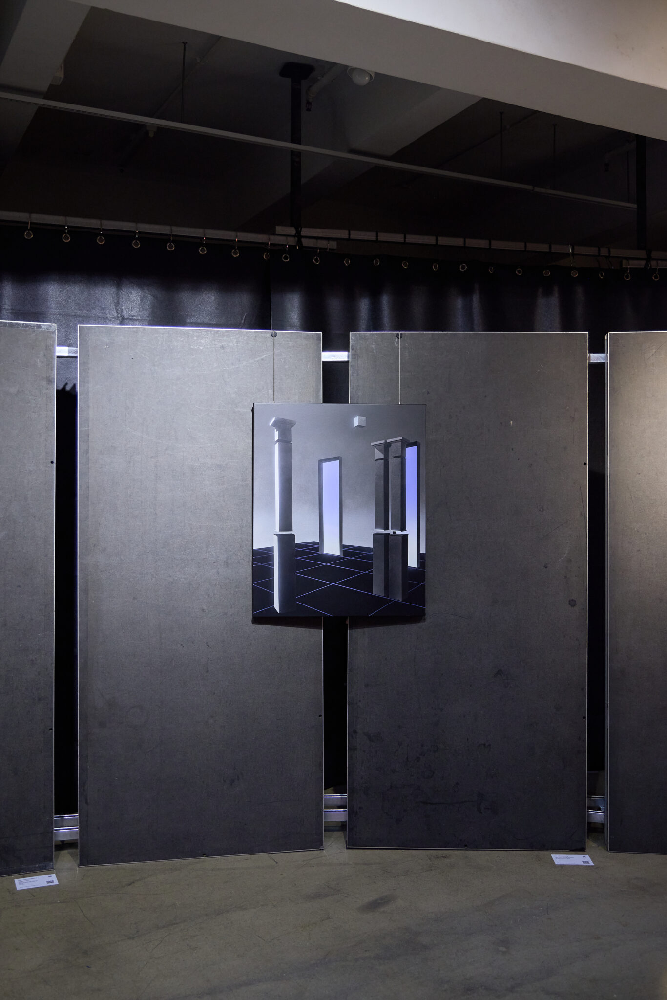 Dony Cheng Hung (b. 1993) lives and works in Hong Kong. Predominantly works with acrylic and charcoal, Dony transforms familiar sights of cityscape into simple blocks of monotone colour with various shades, exploring the subtle variations. Often inspired by daily sceneries in her neighbourhood, the everyday objects are teleported to an alienated and unfamiliar background, juxtaposing the reality with the imagined. In recent years, her endeavours extend into installation and moving images, immersing into the artificial landscape in a three-dimensional space.