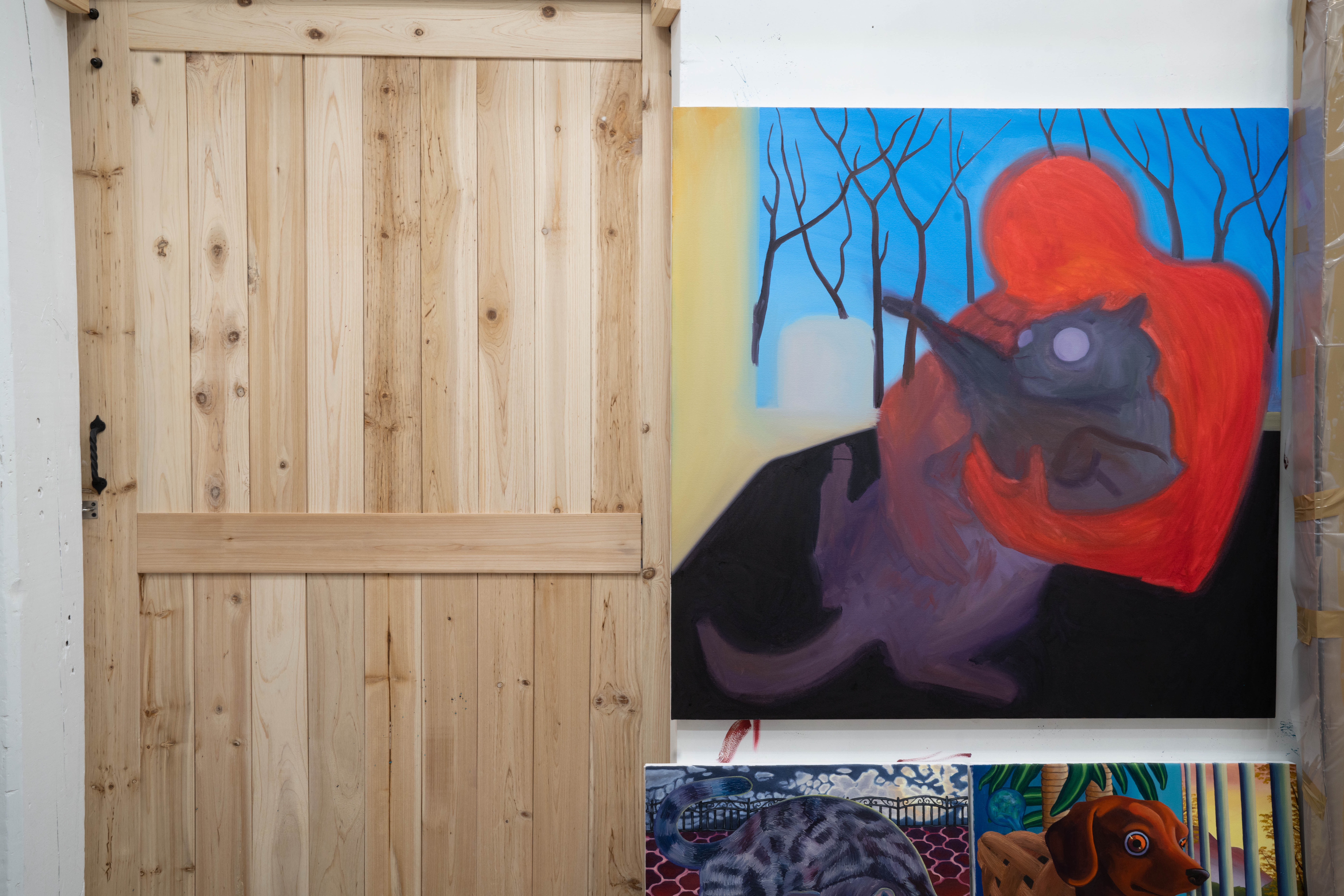 It’s also important that I include the entire image in the painting. That is why figures, as well as the animals and the scene in general, will curl and contort themselves to fit within the frame of the canvas. For my larger works, I sometimes think of them as actual plots of land. Like I’m placing a garden scene into them or some other kind of backyard scene. So I think of it as kind of laying out subjects on top of a surface. That framework of thinking does come from a type of Cubist tradition, also like a symbolist tradition. It’s a way of thinking of the surface of the canvas. For me, it’s almost hieroglyphic, something that informs the construction of stories and also the way I apply it to paintings.